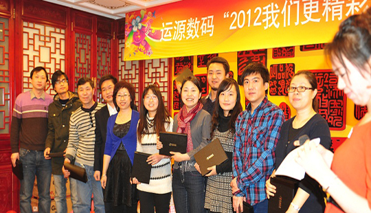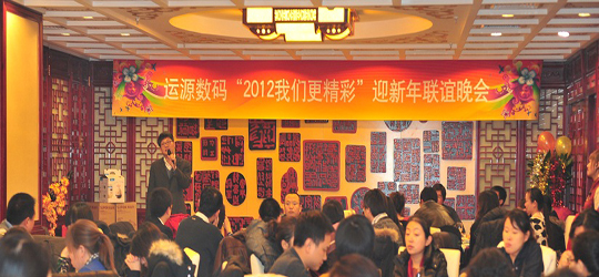 1月13日,运源数码“2012我们更精彩”迎新春联欢晚会在全聚德双榆树店4楼大宴会厅隆重举行。运源总部各部门、以及联创佳艺来宾近80人欢聚一堂,共同见证了一场充满喜庆、澎湃激昂的精彩晚宴。